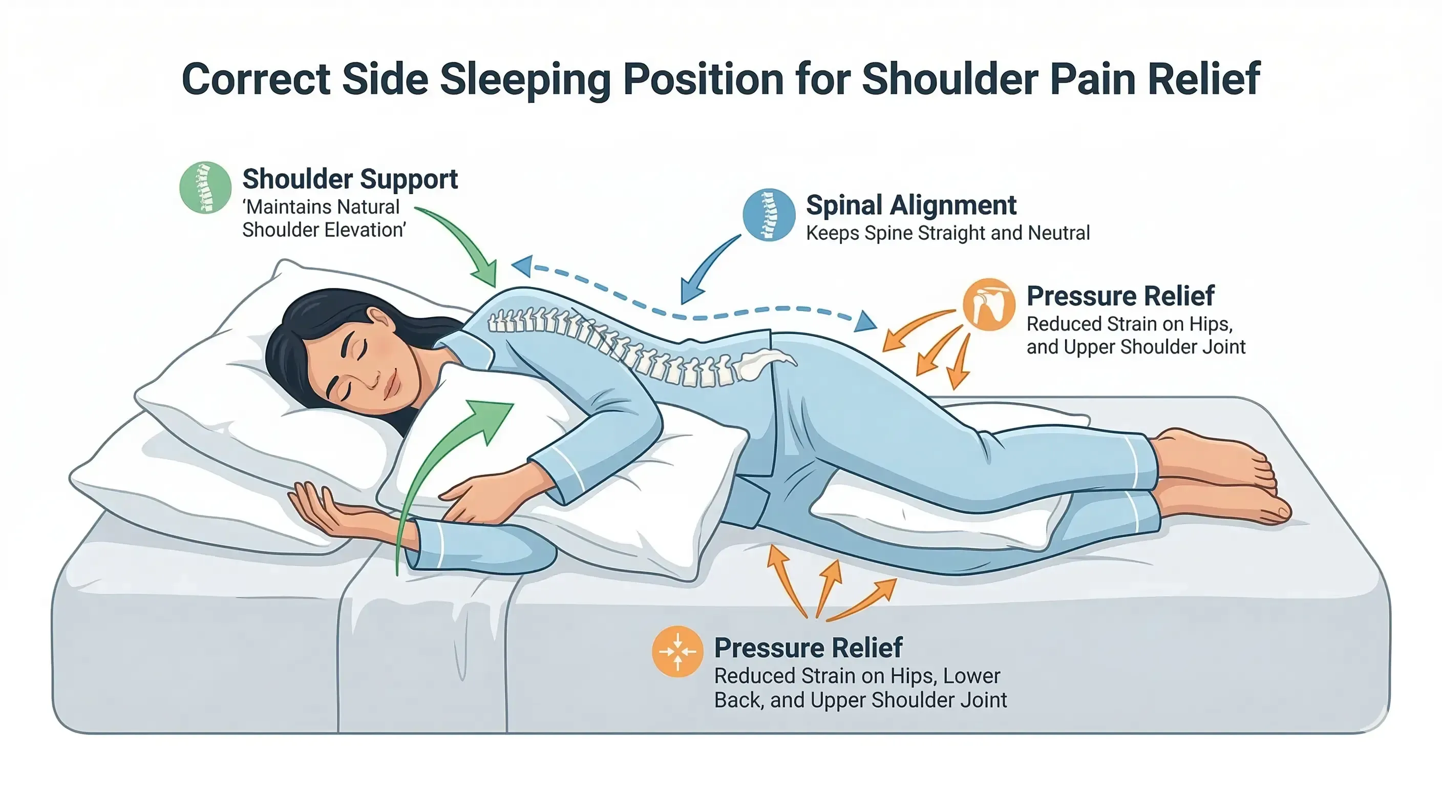 If back sleeping is uncomfortable or you are a committed side sleeper, sleeping on the opposite — unaffected — shoulder is the second-best option. By keeping the painful shoulder facing upward with no body weight on it, you eliminate compressive pressure on the injured joint while still sleeping in your preferred side position.