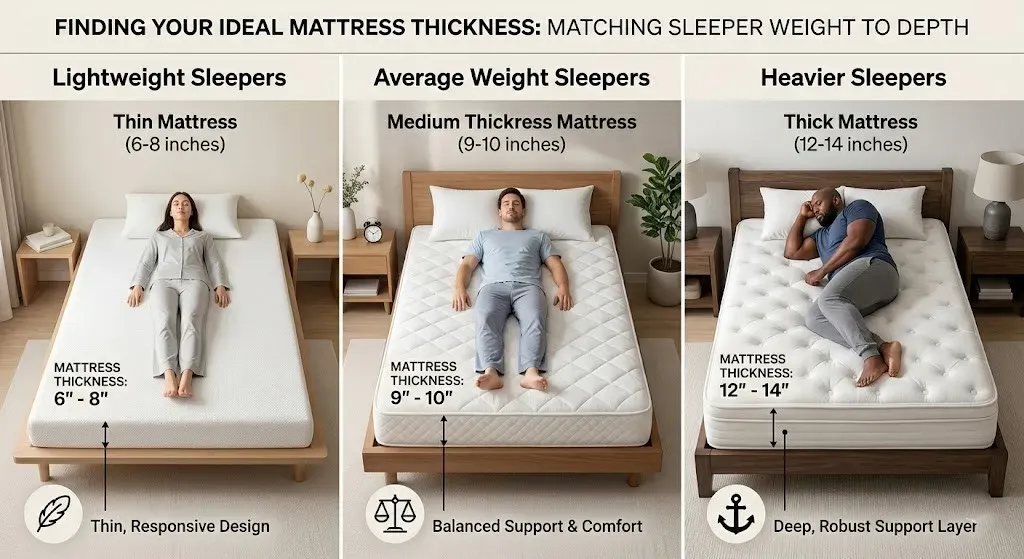 Body weight is one of the single most important factors when determining the right mattress thickness. A mattress that works perfectly for a 130-lb person may offer zero support for someone weighing 250 lbs. Here is how to think about it.